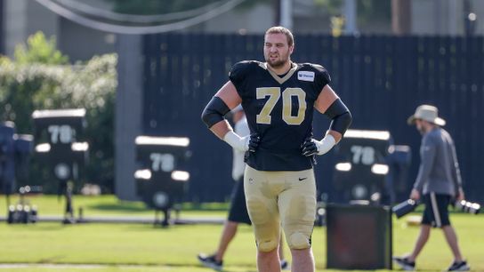 Saints offensive lineman Trevor Penning warms up for practice on Tuesday, Aug. 1, 2023.
