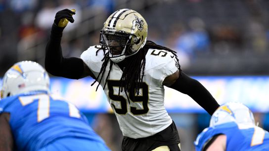 Aug 20, 2023; Inglewood, California, USA; New Orleans Saints linebacker Jaylon Smith (59) looks on against the Los Angeles Chargers during the first half at SoFi Stadium.