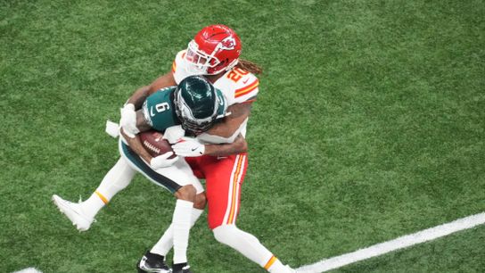 Chiefs safety Justin Reid tackles Eagles wide receiver DeVonta Smith during Super Bowl LIX in the Superdome.