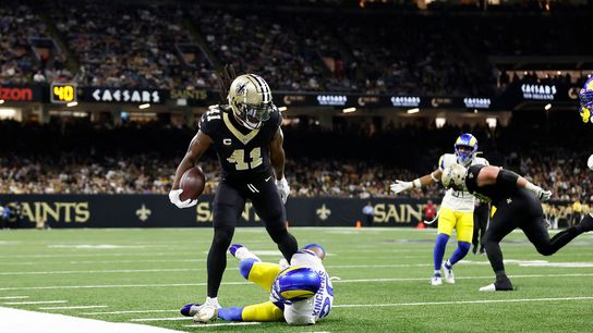 New Orleans Saints running back Alvin Kamara (41) is tripped up byLos Angeles Rams safety Kamren Kinchens (26) during an NFL football game, Sunday, Dec. 1, 2024, in New Orleans.