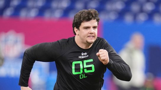 LSU offensive lineman Will Campbell runs a drill at the scouting combine in Indianapolis.