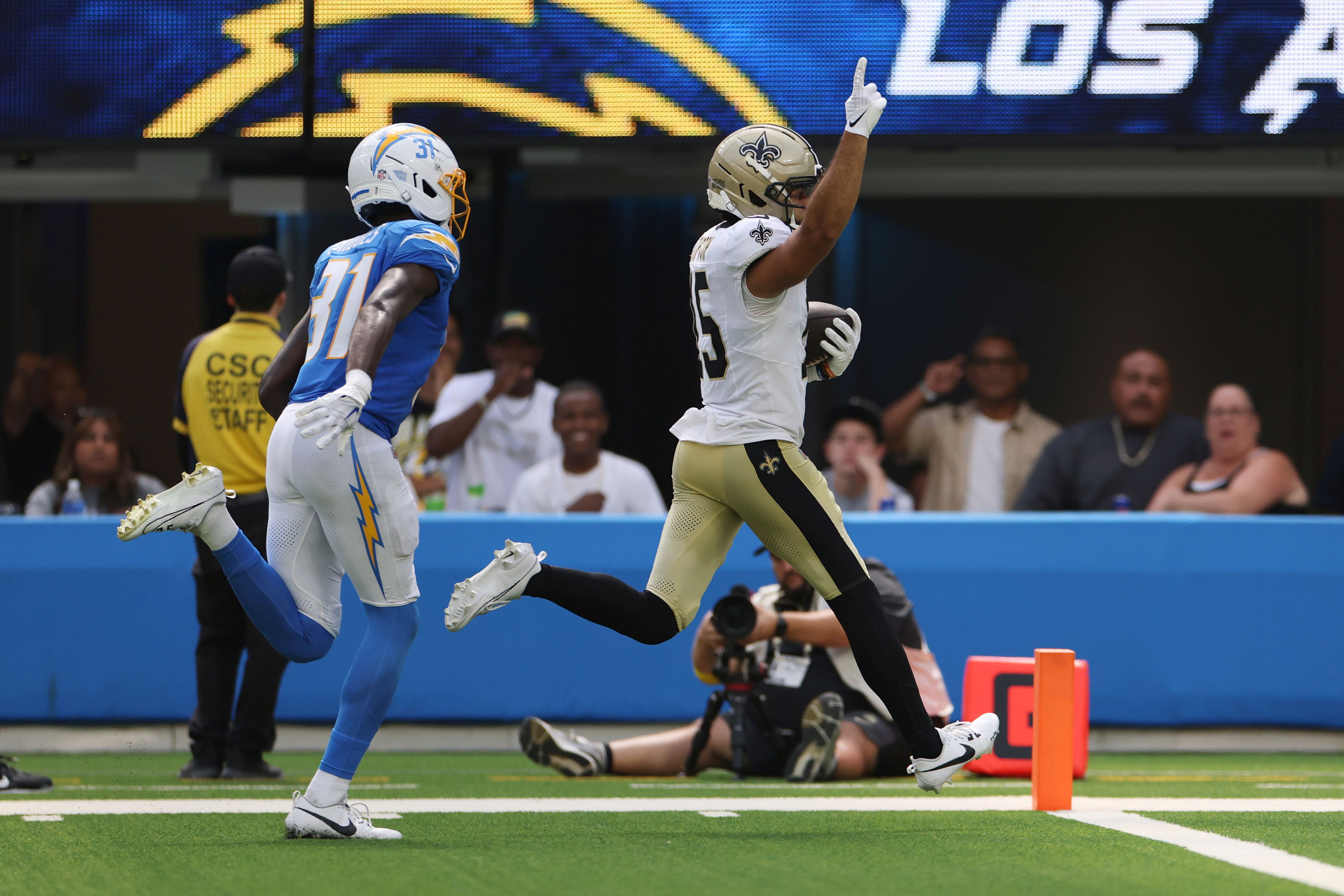 Saints receiver Mason Tipton reels in a 54-yard touchdown catch against the Chargers in Sunday's preseason opener. AP Photo/Eric Thayer