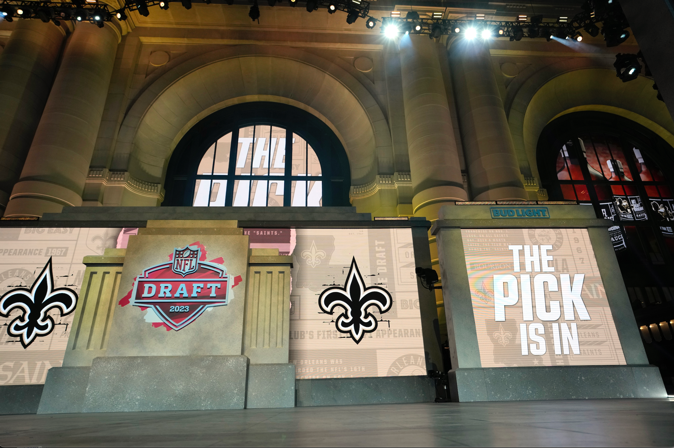 The onstage video screens display "The Pick Is In" for the New Orleans Saints during the 2023 NFL Draft, Thursday, April 27, 2023, in Kansas City (AP Photo/Steve Luciano)