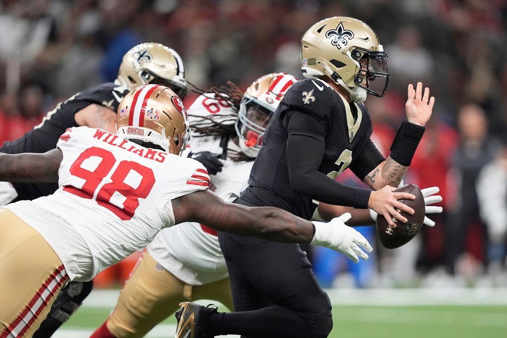 San Francisco 49ers defensive end Mykel Williams (98) applies pressure to Saints quarterback Spencer Rattler during Sunday's game in New Orleans. AP Photo/Gerald Herbert