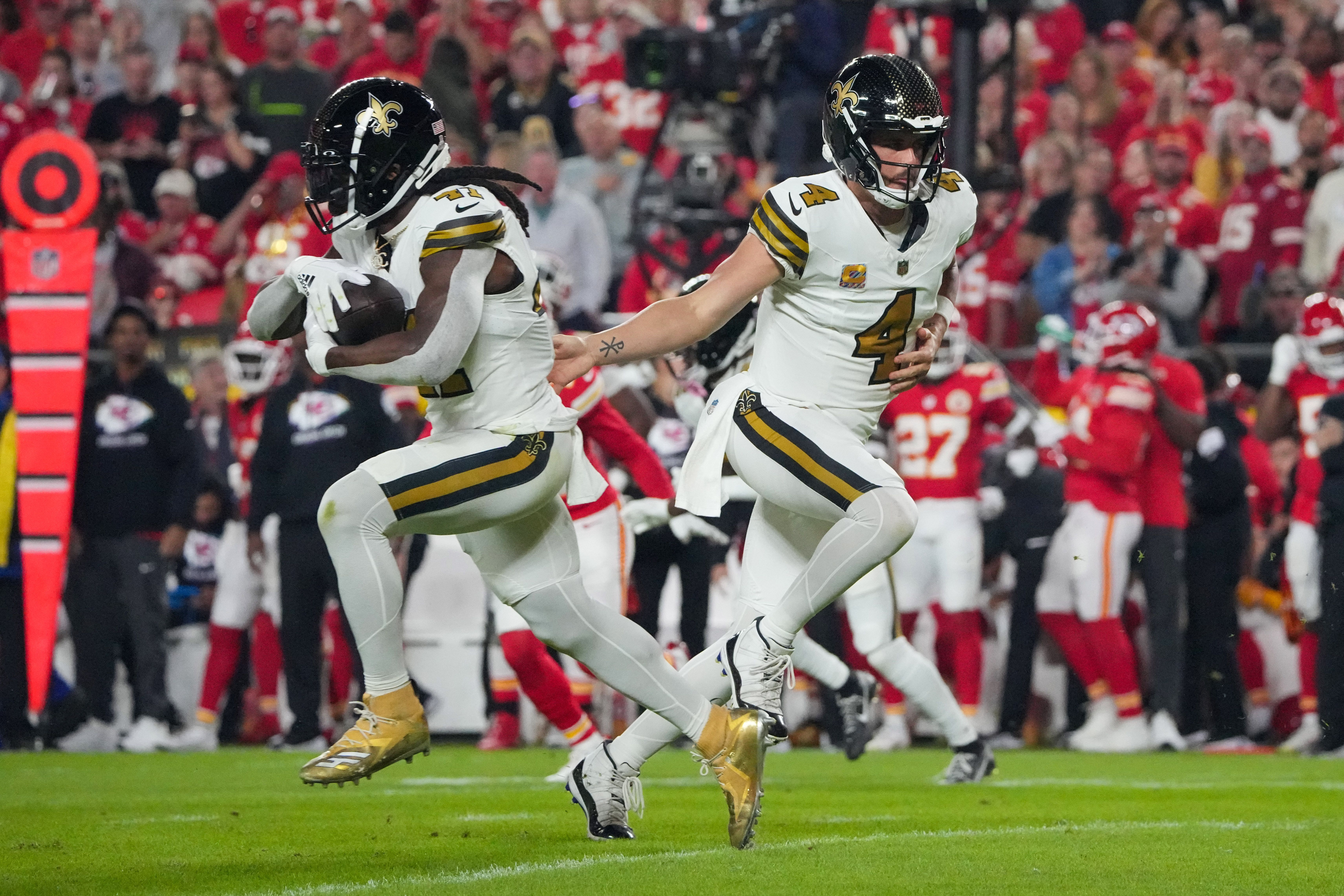 New Orleans Saints quarterback Derek Carr (4) hands off to running back Alvin Kamara (41) against the Kansas City Chiefs during the first half at GEHA Field at Arrowhead Stadium Denny Medley-Imagn Images