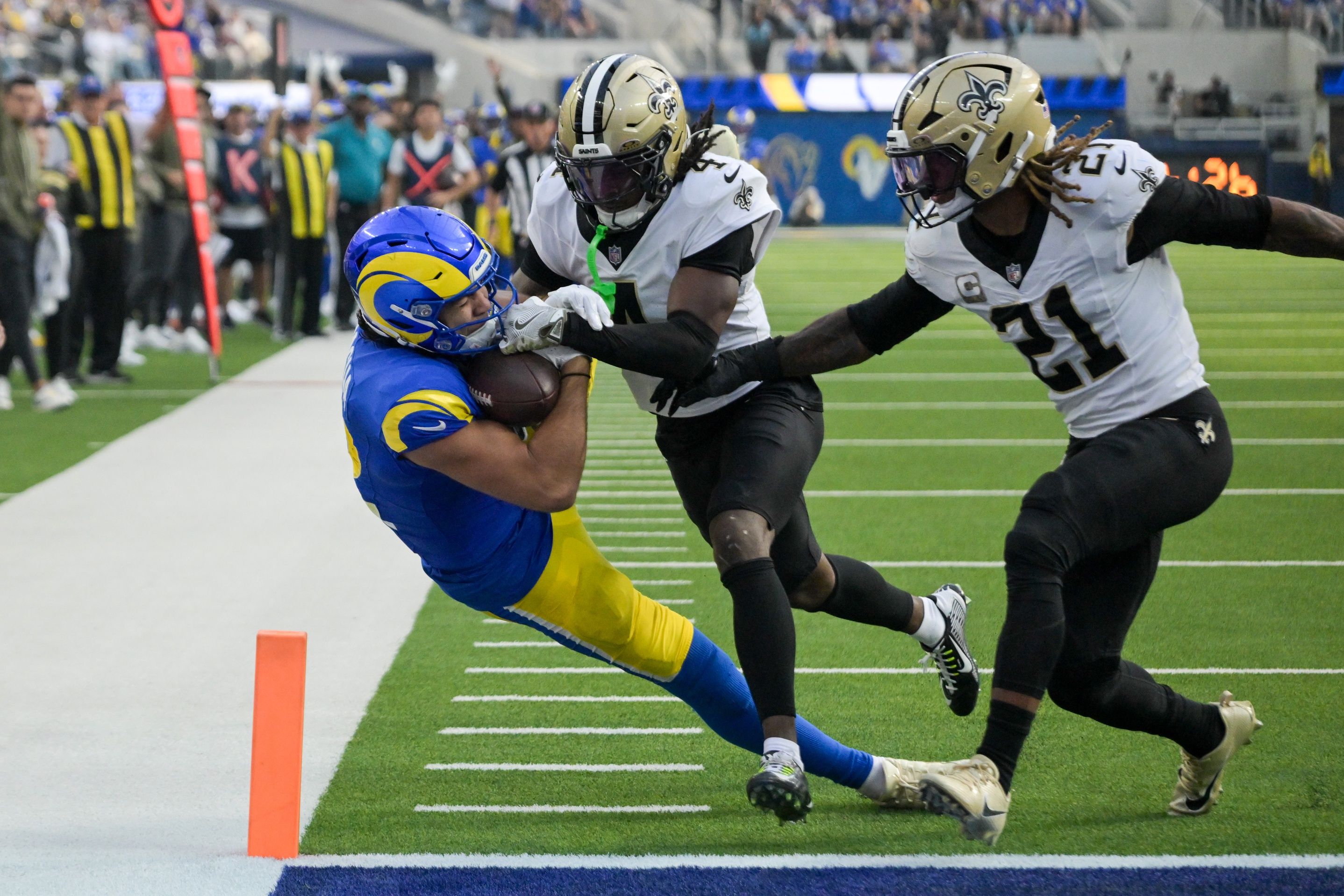 Los Angeles Rams wide receiver Puka Nacua (12) scores a touchdown as New Orleans Saints cornerback Kool-Aid McKinstry (4) and safety Justin Reid (21) defend during the first half at SoFi Stadium. Jayne Kamin-Oncea-Imagn Images