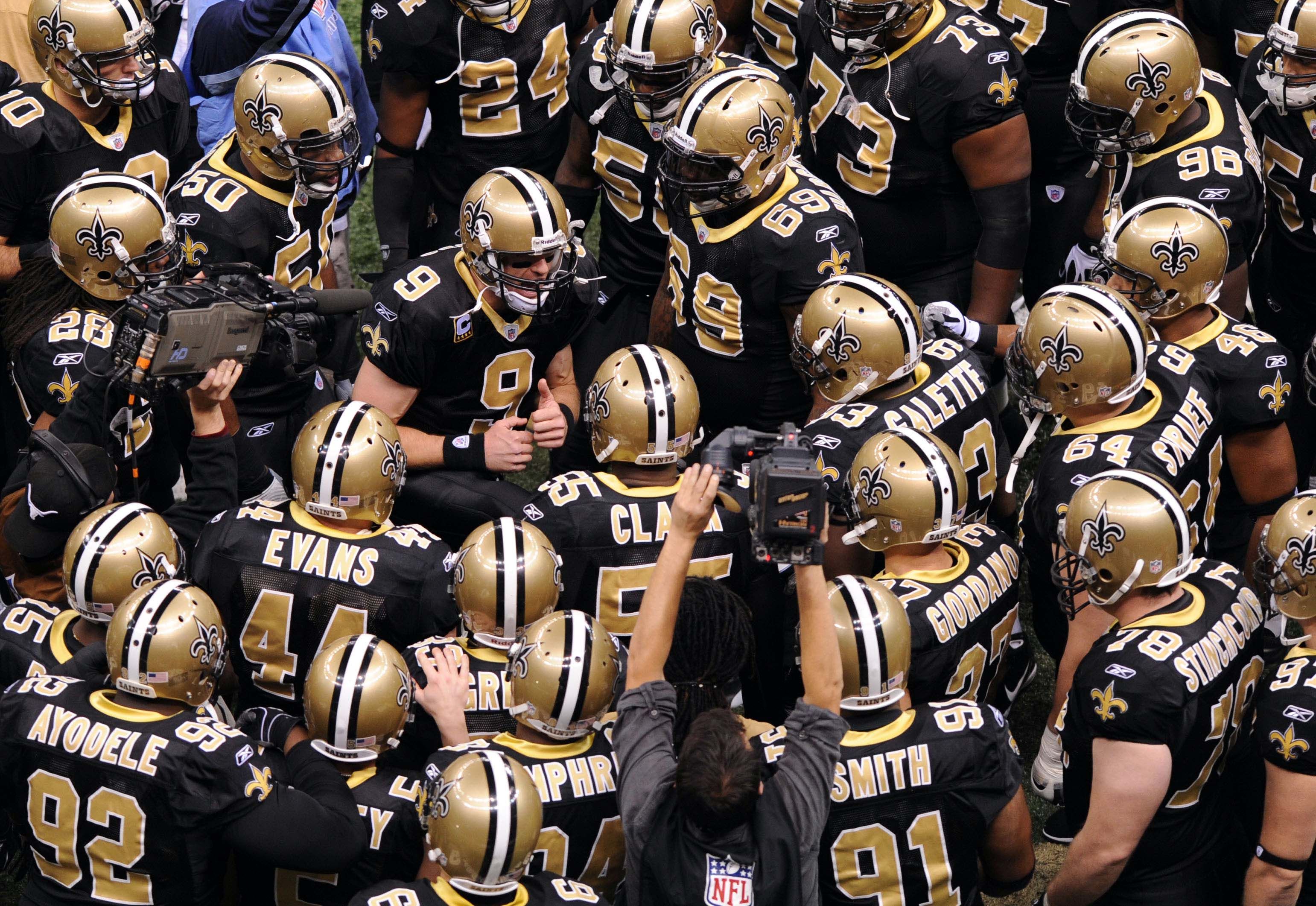New Orleans Saints quarterback Drew Brees (9) huddles with his teammates before the start of their game against the Seattle Seahawks. Chuck Cook/USA TODAY Sports