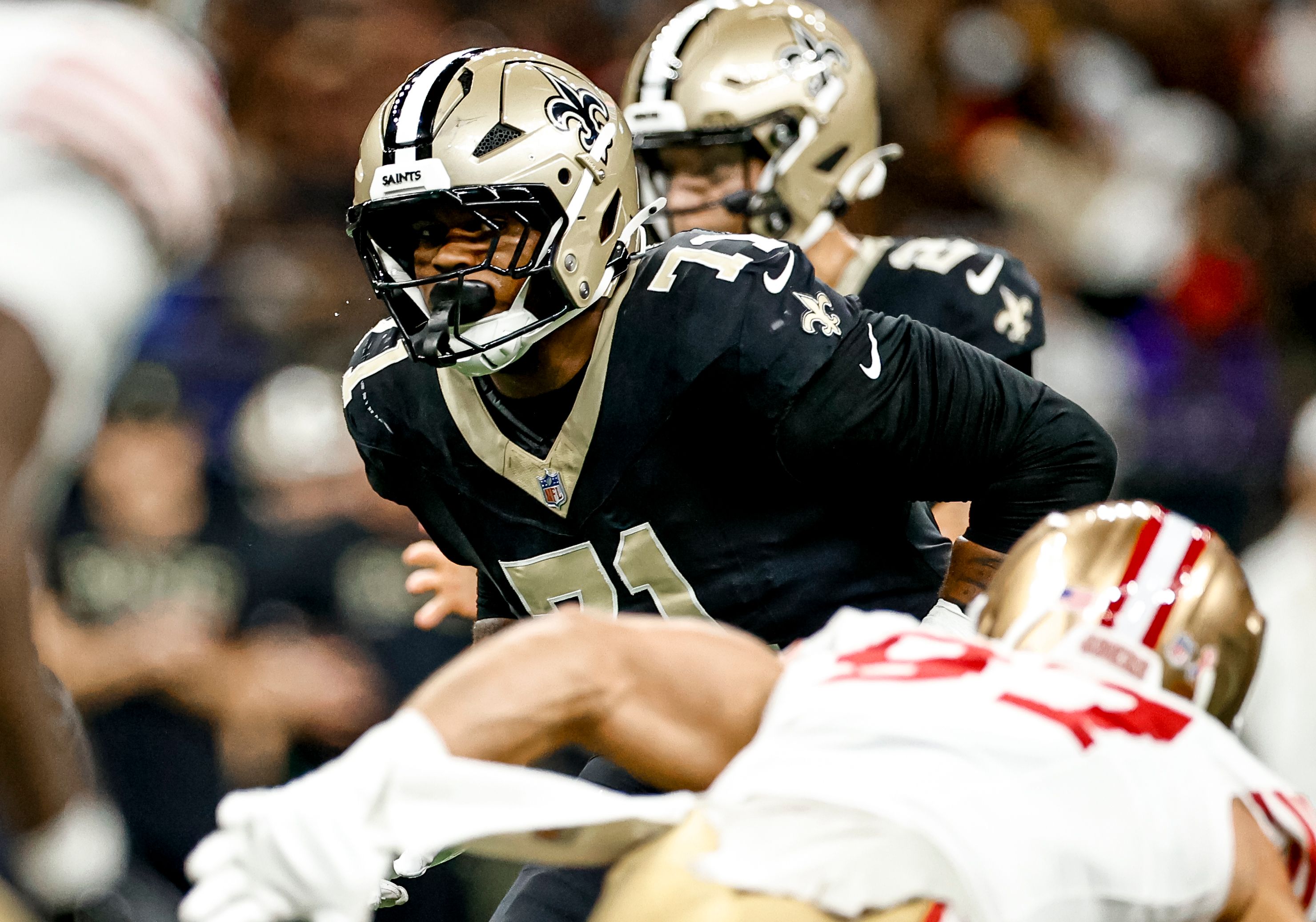 New Orleans Saints left tackle Kelvin Banks Jr. lines up against the San Francisco 49ers. Derick E. Hingle/NewOrleans.Football
