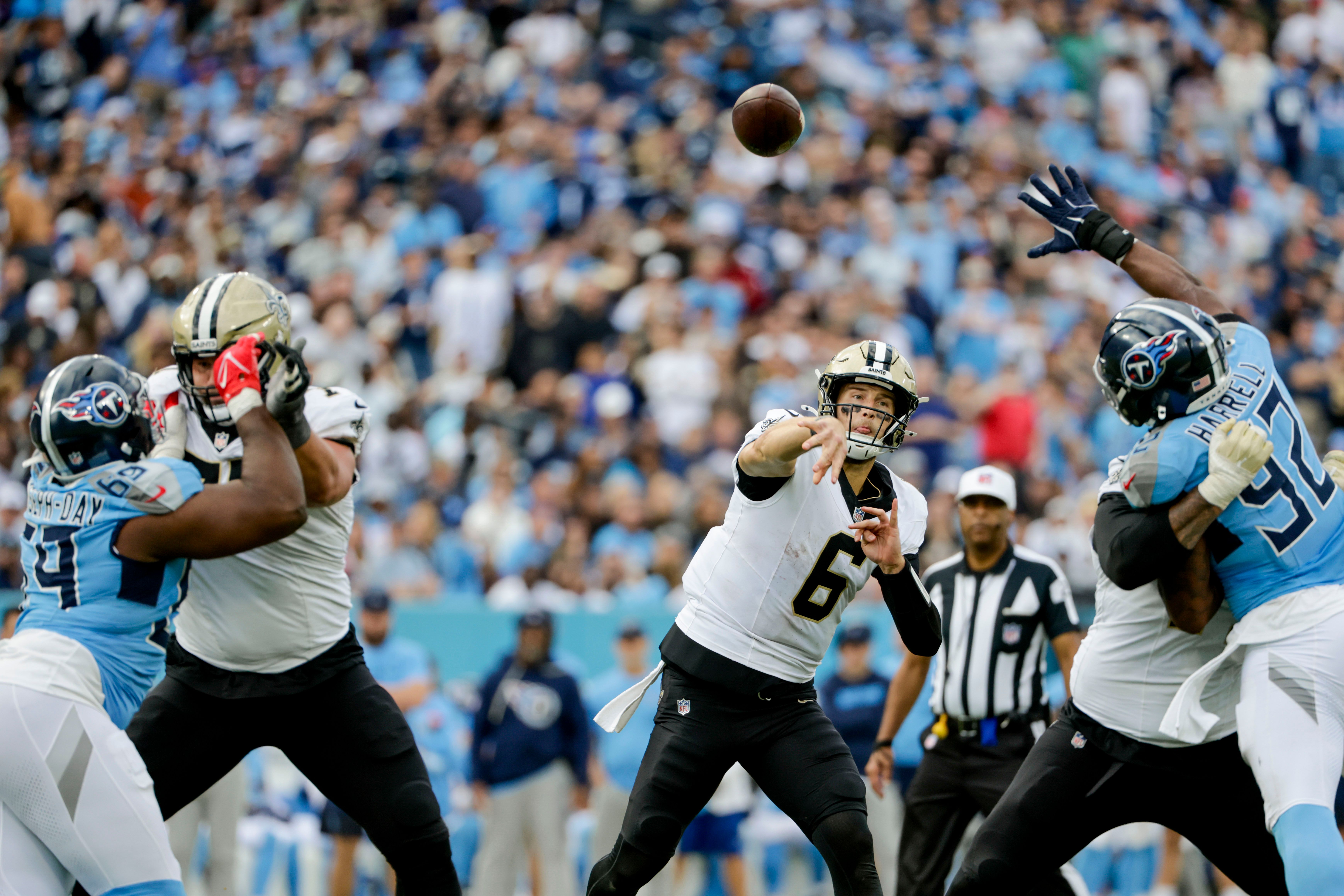 New Orleans Saints quarterback Tyler Shough throws a pass against the Tennessee Titans. Derick E. Hingle/NewOrleans.Football