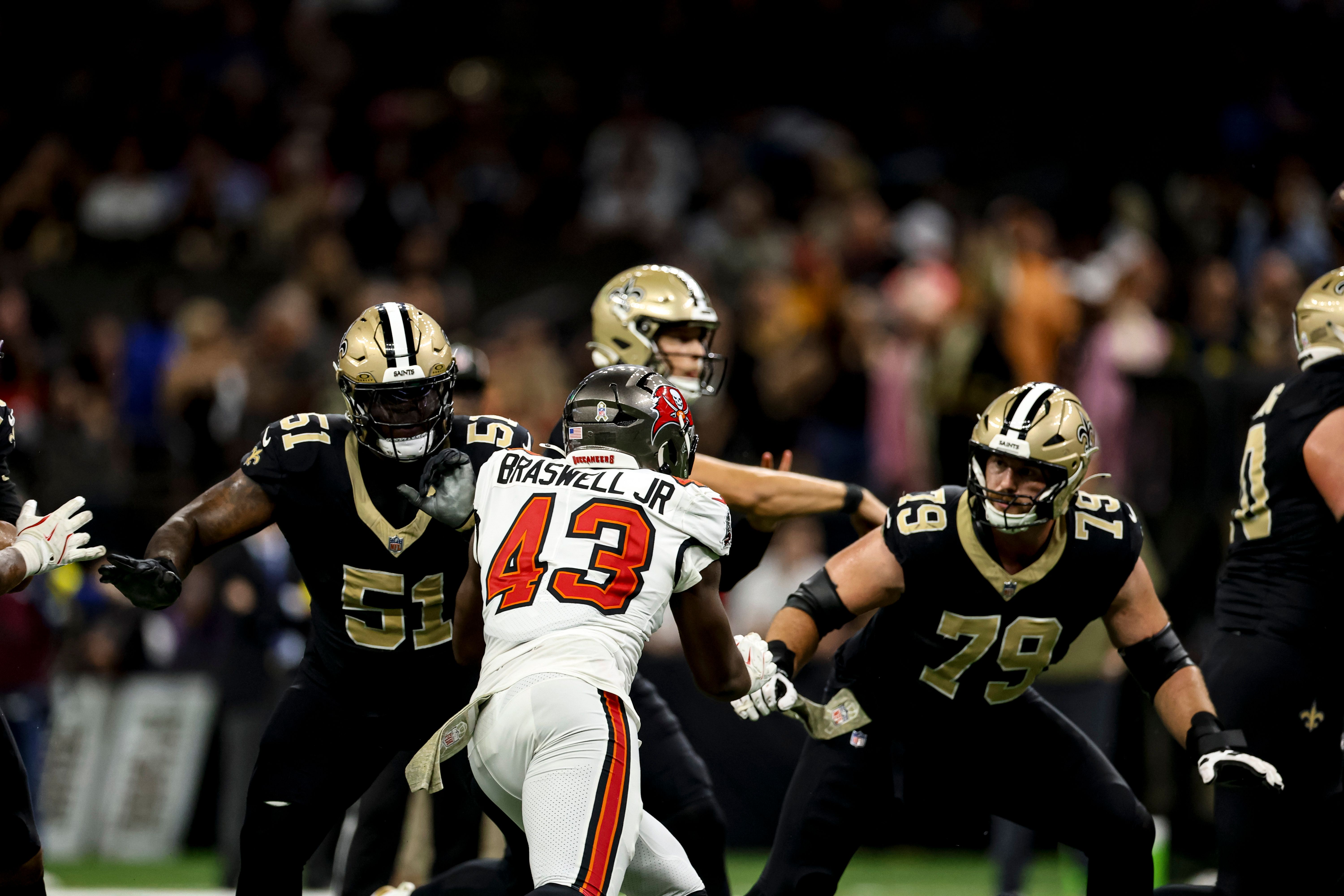 New Orleans Saints offensive linemen Cesar Ruiz (51) and Luke Fortner (79) block Tampa Bay Buccaneers linebacker Chris Braswell (43). Derick E. Hingle/NewOrleans.Football