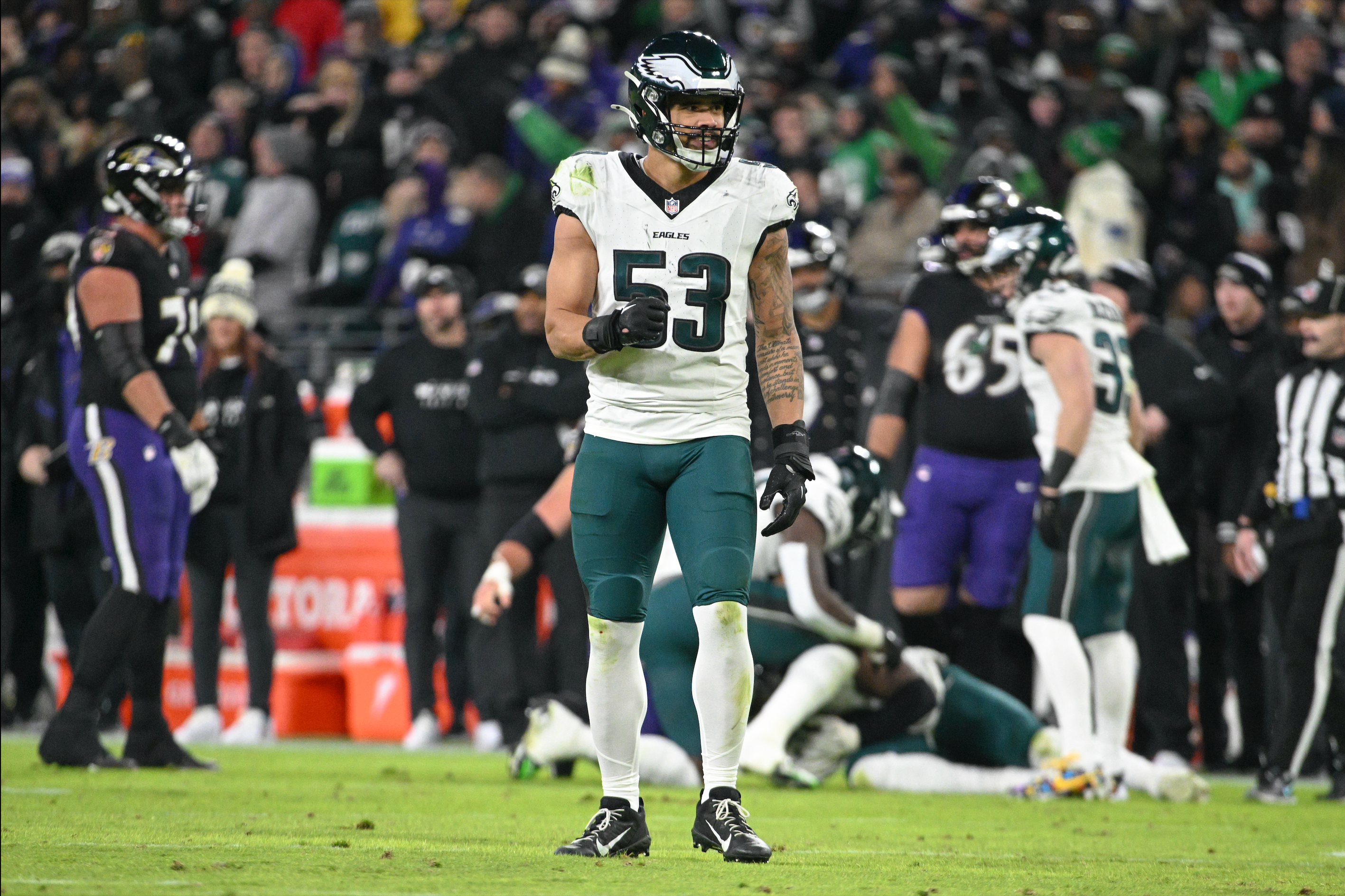 Philadelphia Eagles linebacker Zack Baun (53) reacts during the game against the Baltimore Ravens at M&T Bank Stadium. Tommy Gilligan-Imagn Images