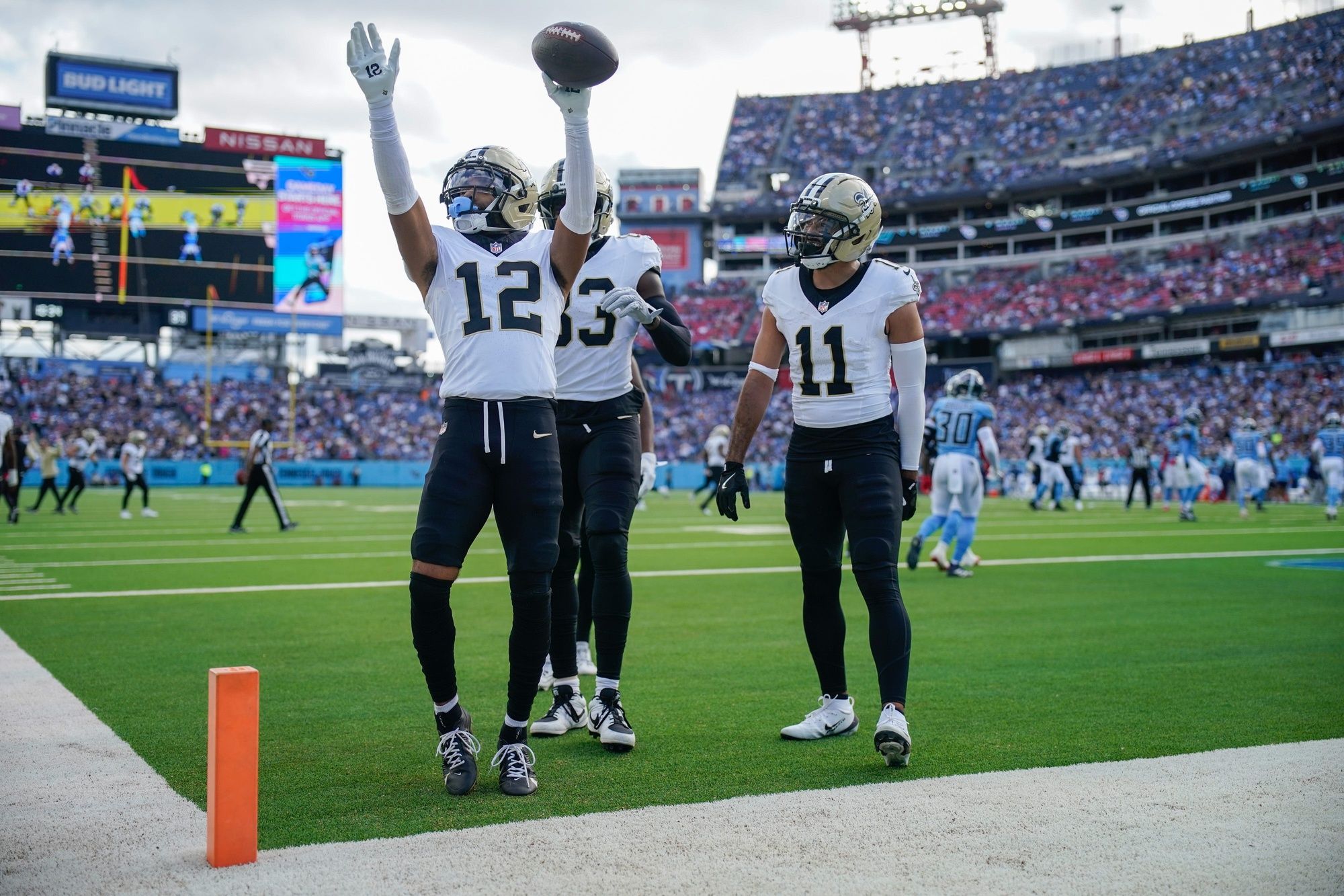 New Orleans Saints wide receiver Chris Olave (12) celebrates his touchdown during the third quarter against the Tennessee Titans at Nissan Stadium in Nashville, Tenn., on Sunday. Andrew Nelles / The Tennessean / USA TODAY NETWORK via Imagn Images