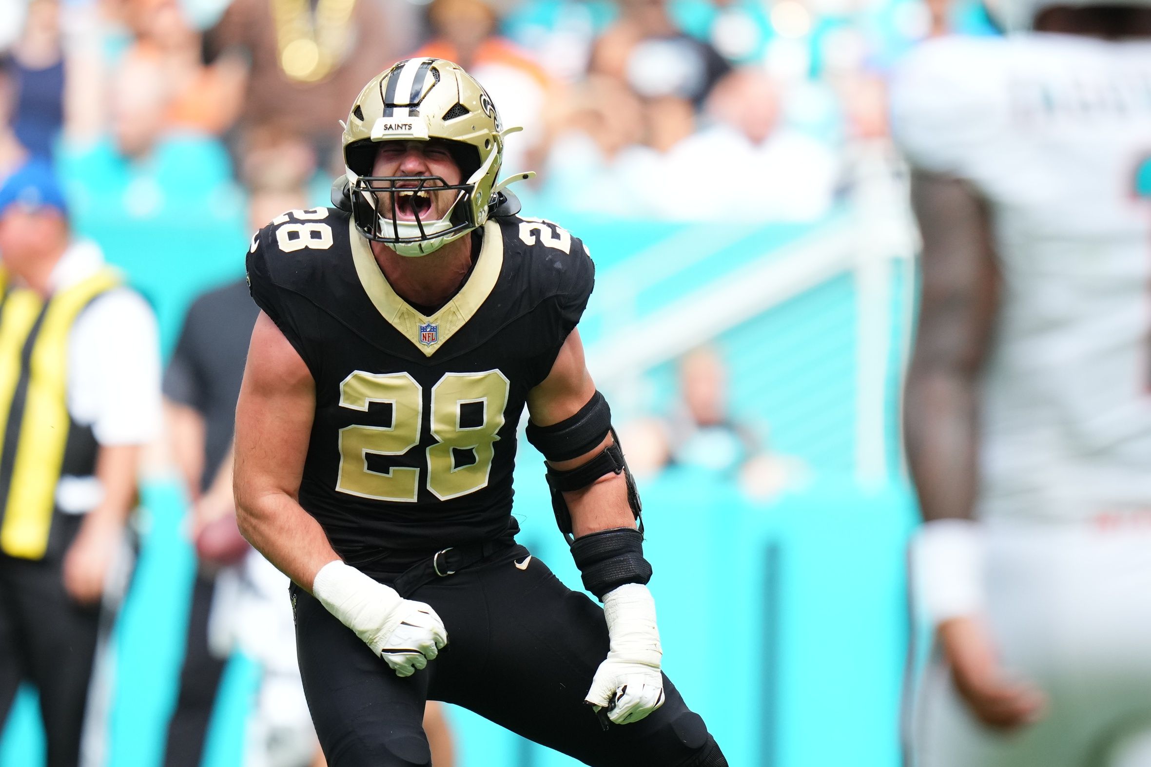 New Orleans Saints linebacker Danny Stutsman (28) reacts after making a tackle against the Miami Dolphins during the first half at Hard Rock Stadium. Rich Storry-Imagn Images